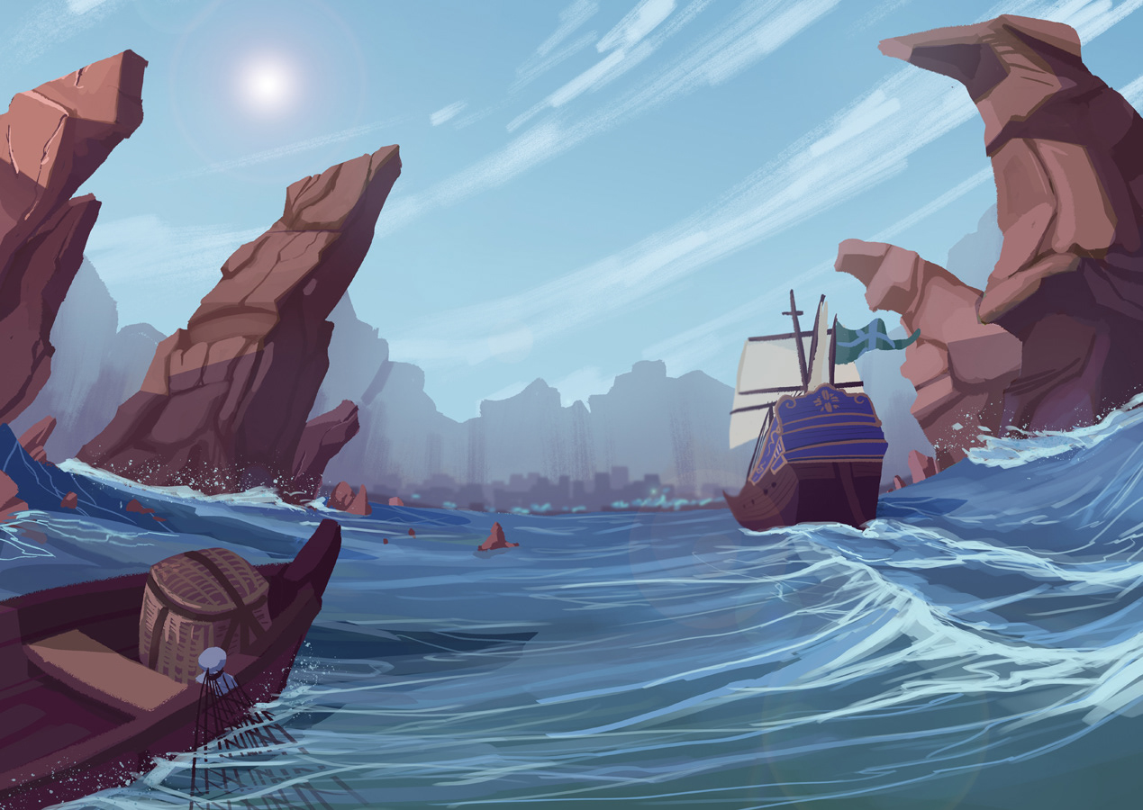 Concept work for Canon of the Dragon's Ribs, a rock formation that makes for treacherous sailing outside of The Pit.